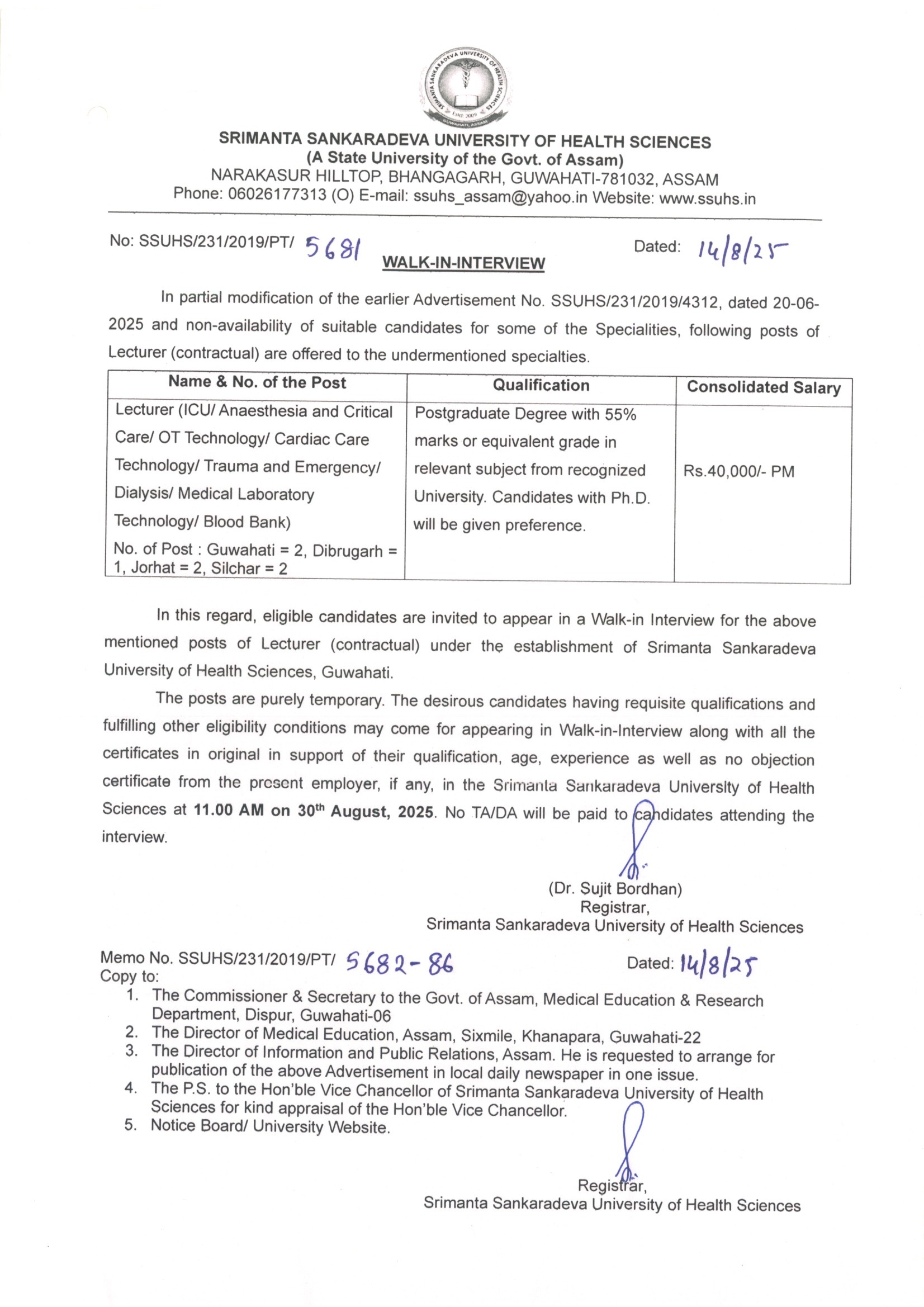- Admission Notice- Admission into Medical Technology (Paramedical) Degree / Diploma courses in the Medical Colleges of Assam under SSUHS for the academic session 2025-26 new